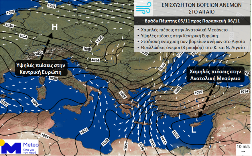 Η ενίσχυση οφείλεται στο συνδυασμό χαμηλών πιέσεων στην Ανατολική Μεσόγειο με υψηλές στην Κεντρική Ευρώπη όπως φαίνεται και στον χάρτη που ακολουθεί, όπου ενδεικτικά παρουσιάζεται η κατανομή της βαρομετρικής πίεσης και ο επιφανειακός άνεμος το βράδυ της Πέμπτης προς Παρασκευή.