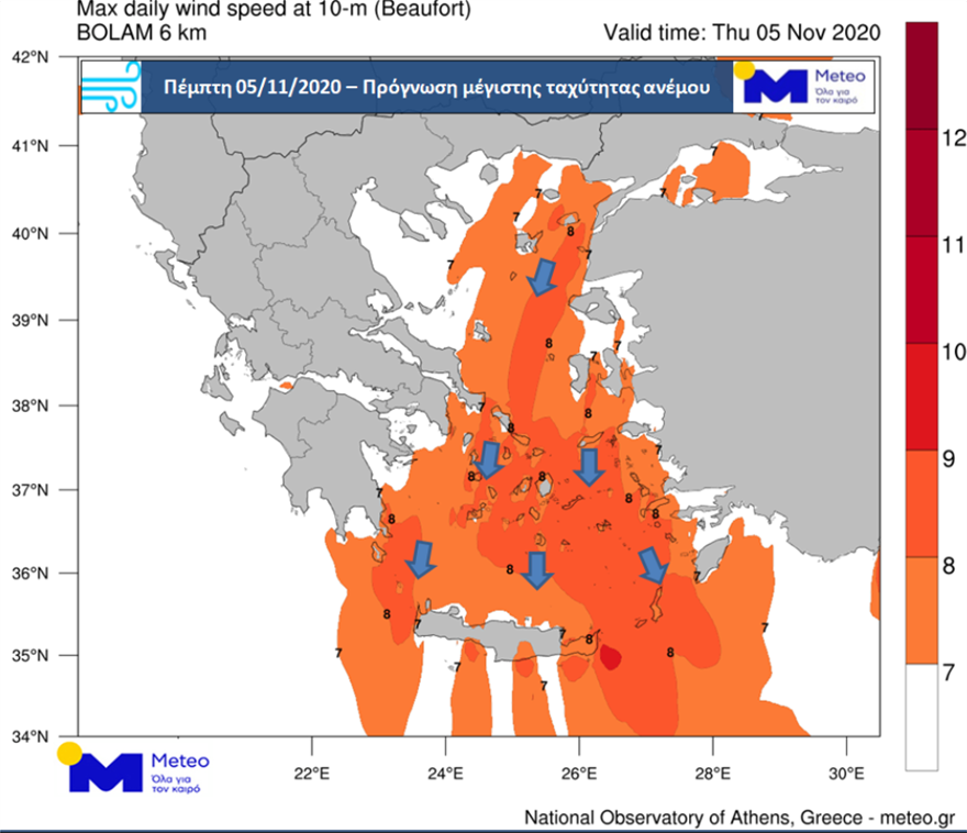Σύμφωνα με τα τελευταία προγνωστικά δεδομένα του Εθνικού Αστεροσκοπείου Αθηνών / meteo.gr, από σήμερα Πέμπτη 5 Νοεμβρίου, αναμένεται να υπάρξει σταδιακή ενίσχυση των ανέμων.