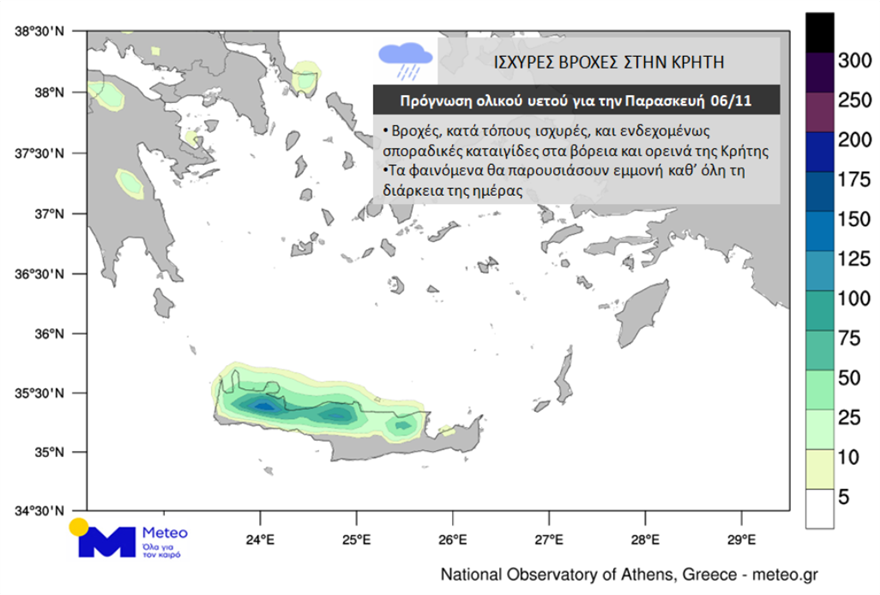 Παράλληλα, βροχοπτώσεις θα σημειωθούν κυρίως στην Ανατολική Στερεά Ελλάδα και Πελοπόννησο, στην Εύβοια, στις Κυκλάδες και στην Κρήτη. Τα φαινόμενα στα βόρεια και ορεινά της Κρήτης θα παρουσιάσουν εμμονή καθ’ όλη τη διάρκεια της ημέρας και θα είναι κατά τόπους ισχυρά, ενώ υπάρχει πιθανότητα εκδήλωσης σποραδικών καταιγίδων.