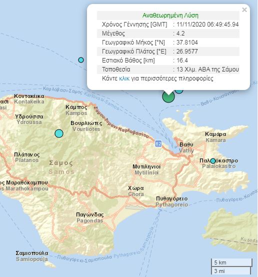 Το επίκεντρο της δόνησης εντοπίζεται στον θαλάσσιο χώρο 13 χιλιόμετρα ανατολικά-βορειοανατολικά της Σάμου.