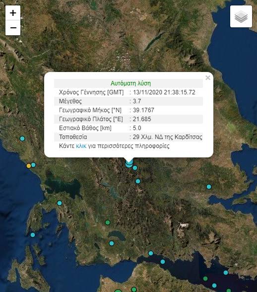 Σύμφωνα με την αυτόματη λύση του γεωδυναμικού ινστιτούτου, το επίκεντρο του σεισμού εντοπίζεται 29 χλμ. ΝΔ της Καρδίτσας και σημειώθηκε στις 23:38 της Παρασκευής, 13 Νοεμβρίου.