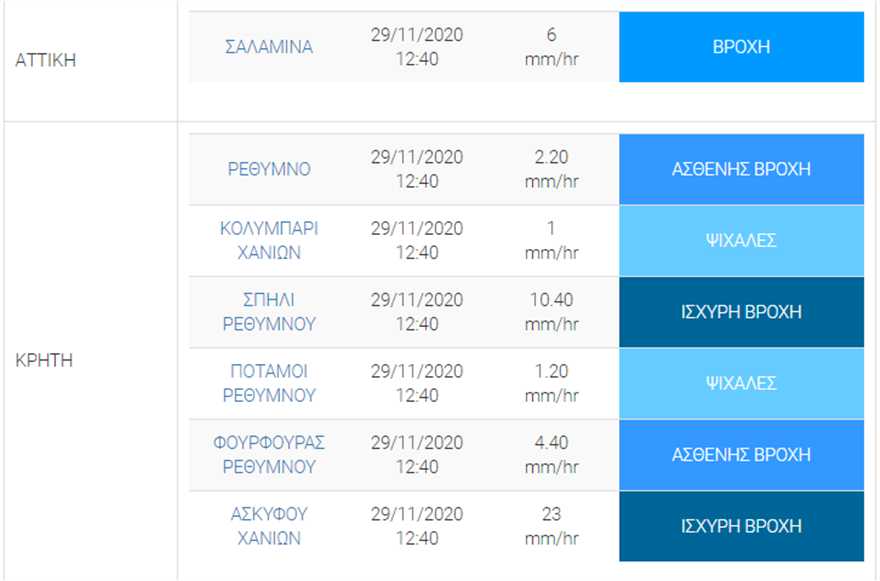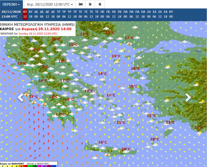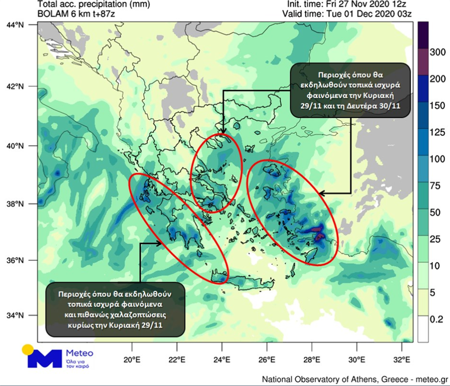 Πιο αναλυτικά, την Κυριακή 29 Νοεμβρίου 2020 αρχικά τοπικά ισχυρές βροχές και καταιγίδες θα εκδηλώνονται στο Ιόνιο, στα δυτικά ηπειρωτικά και στη Δυτική Κρήτη, περιοχές όπου υπάρχει αυξημένη πιθανότητα να εκδηλωθούν και τοπικές χαλαζοπτώσεις. Βαθμιαία οι βροχές θα επεκταθούν σχεδόν στο σύνολο της χώρας, συνοδευόμενες από καταιγίδες κυρίως στα δυτικά και νότια ηπειρωτικά, στις Κυκλάδες, στην Κρήτη και στα Δωδεκάνησα.