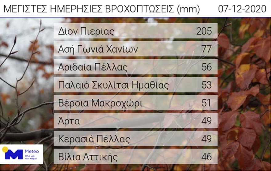 Από εκεί και πέρα, η περισσότερη βροχή έπεσε στη Βόρεια Ελλάδα και πιο συγκεκριμένα στην Πιερία, σύμφωνα με τα στοιχεία από τους 8 σταθμούς του δικτύου αυτόματων μετεωρολογικών σταθμών του Εθνικού Αστεροσκοπείου Αθηνών / meteo.gr, τα οποία κατέγραψαν τα μεγαλύτερα ύψη βροχής. Συγκεκριμένα, στο Δίον Πιερίας η ολική βροχόπτωση έως το μεσημέρι της Δευτέρας έφτασε τα 205 χιλιοστά βροχής, προκαλώντας μεγάλα προβλήματα στην περιοχή.