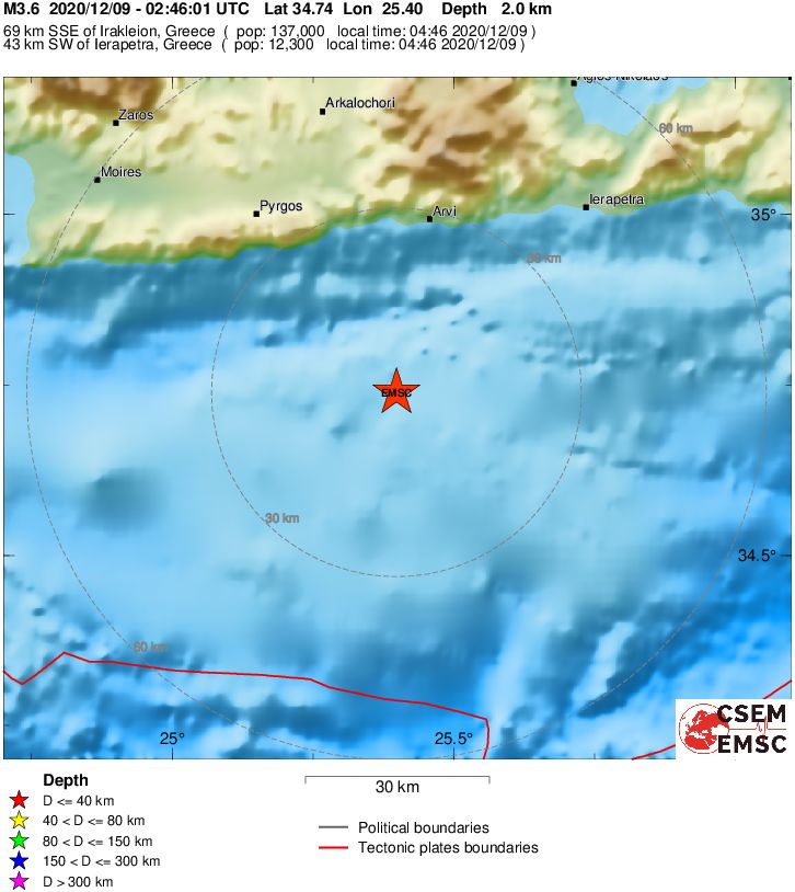 Σεισμός μεγέθους 3,6 βαθμών της κλίμακας Ρίχτερ, σύμφωνα με την αναθεωρημένη λύση του Ευρωπαϊκού – Μεσογειακού Σεισμολογικού Ινστιτούτου, σημειώθηκε τα ξημερώματα της Τετάρτης 9 Δεκεμβρίου, στις 04:46, σε υποθαλάσσια περιοχή του Νότιου Κρητικού Πελάγους.