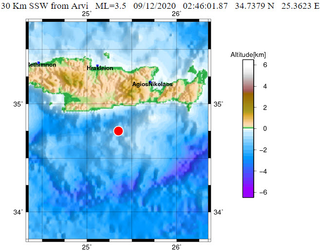 H αυτόματη λύση του Γεωδυναμικού Ινστιτούτου του Αστεροσκοπείου Αθηνών δίνει το σεισμό στα 3,5 Ρίχτερ, με εστιακό βάθος τα 10 χλμ., και επίκεντρο τα 30 χλμ. νότια-νοτιοδυτικά της Άρβης.