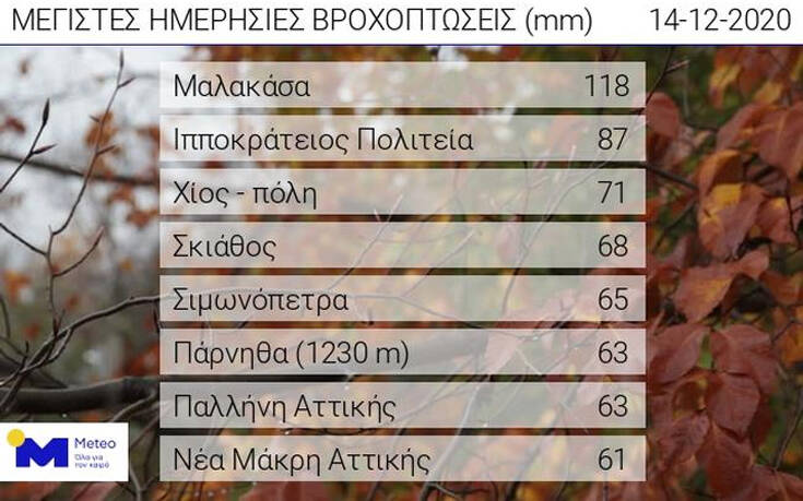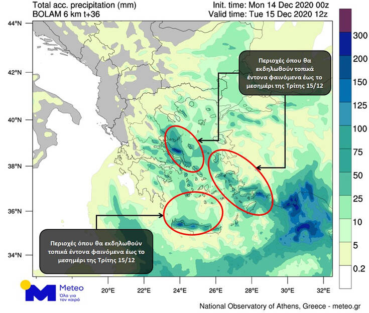 Σύμφωνα με τα προγνωστικά στοιχεία του Εθνικού Αστεροσκοπείου Αθηνών/meteo.gr, τα φαινόμενα κατά τη διάρκεια της ημέρας θα συνεχιστούν με φθίνουσα ένταση, ενώ από τις απογευματινές ώρες θα αρχίσουν να περιορίζονται στις Σποράδες και κυρίως στην Εύβοια και στην Κρήτη, όπου θα επιμείνουν μέχρι τις μεσημεριανές ώρες της Τρίτης 15/12.