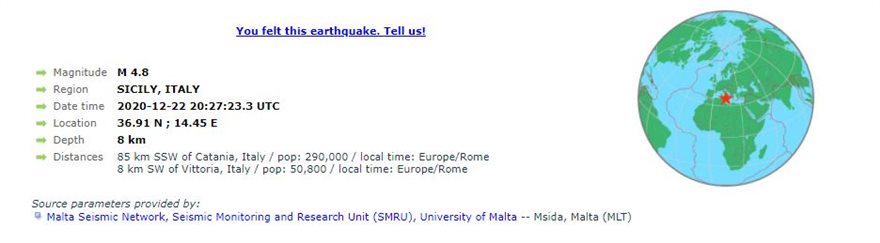 Σύμφωνα με το Ευρωπαϊκό Μεσογειακό Σεισμολογικό Κέντρο ο σεισμός ταρακούνησε τη Σικελία στις 16:27 τοπική ώρα.