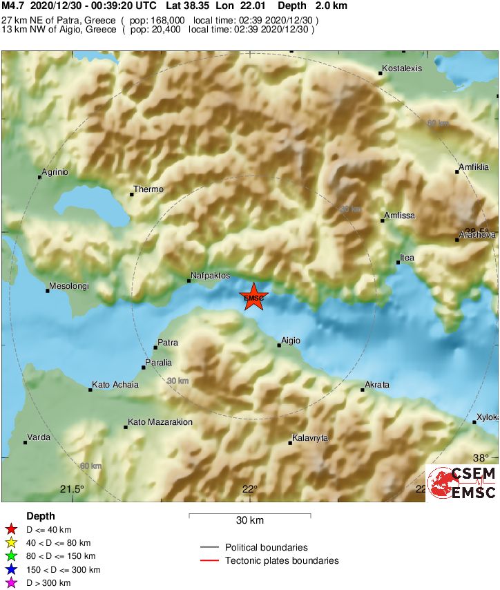 Σεισμός μεγέθους 4,7 βαθμών της κλίμακας Ρίχτερ, σύμφωνα με την αυτόματη λύση του Ευρωπαϊκού – Μεσογειακού Σεισμολογικού Ινστιτούτου (EMSC), σημειώθηκε τα ξημερώματα της Τετάρτης (30/12), στις 02:39, σε θαλάσσια περιοχή, στα δυτικά του Κορινθιακού Κόλπου.
