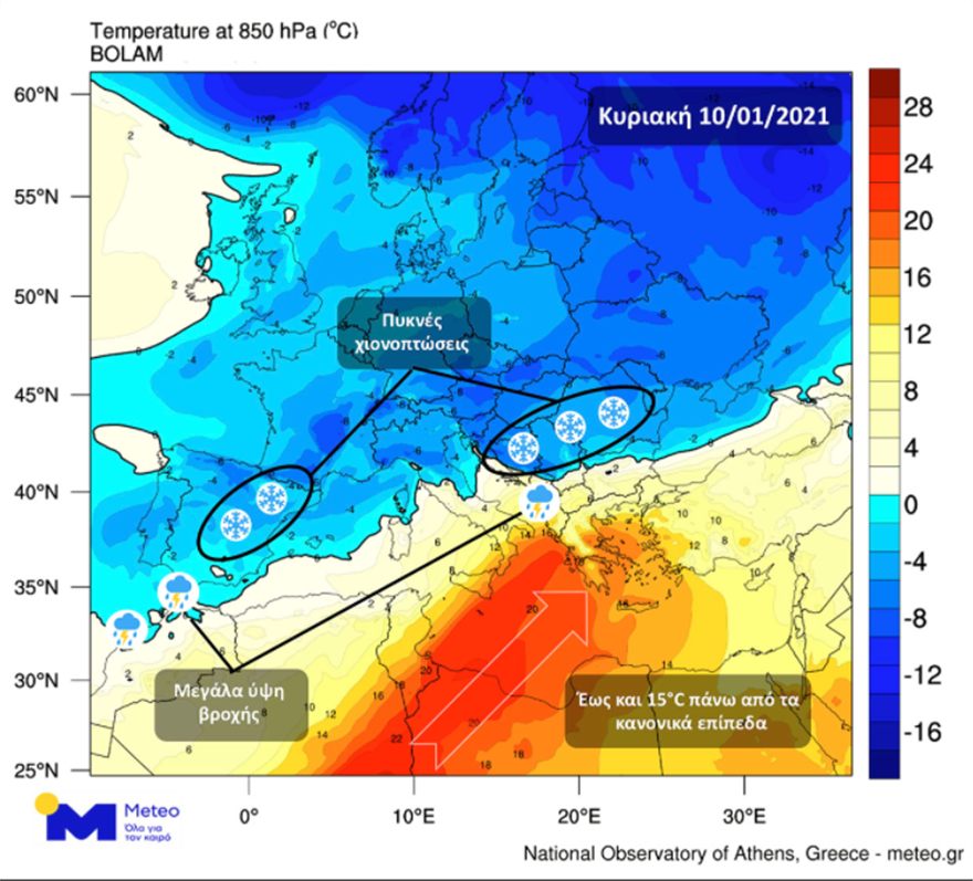 Η μεταφορά ψυχρών αερίων μαζών σε ασυνήθιστα μικρά γεωγραφικά πλάτη πάνω από τη δυτική Ευρώπη και τη βορειοδυτική Αφρική, θα προκαλέσει τη μεταφορά πολύ θερμών αερίων μαζών προς την περιοχή μας.