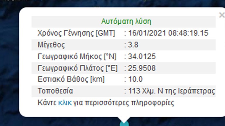Η δόνηση είχε εστιακό βάθος 10 χλμ. και επίκεντρο που εντοπίζεται στα 13 χλμ.νότια της Ιεράπετρας.