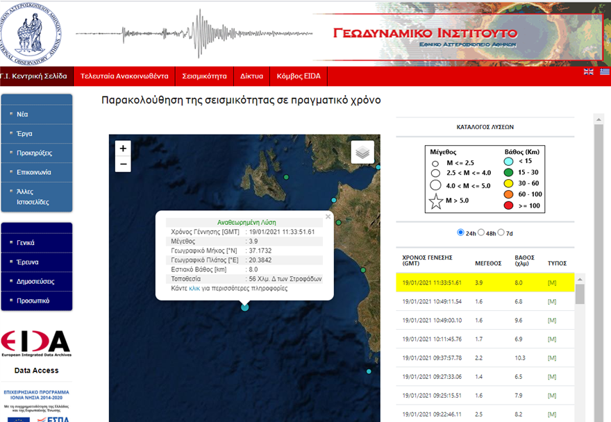 Σεισμική δόνηση μεγέθους 3,9 βαθμών της κλίμακας Ρίχτερ σημειώθηκε πριν από λίγη ώρα στα δυτικά των Στροφάδων στο Ιόνιο Πέλαγος.
