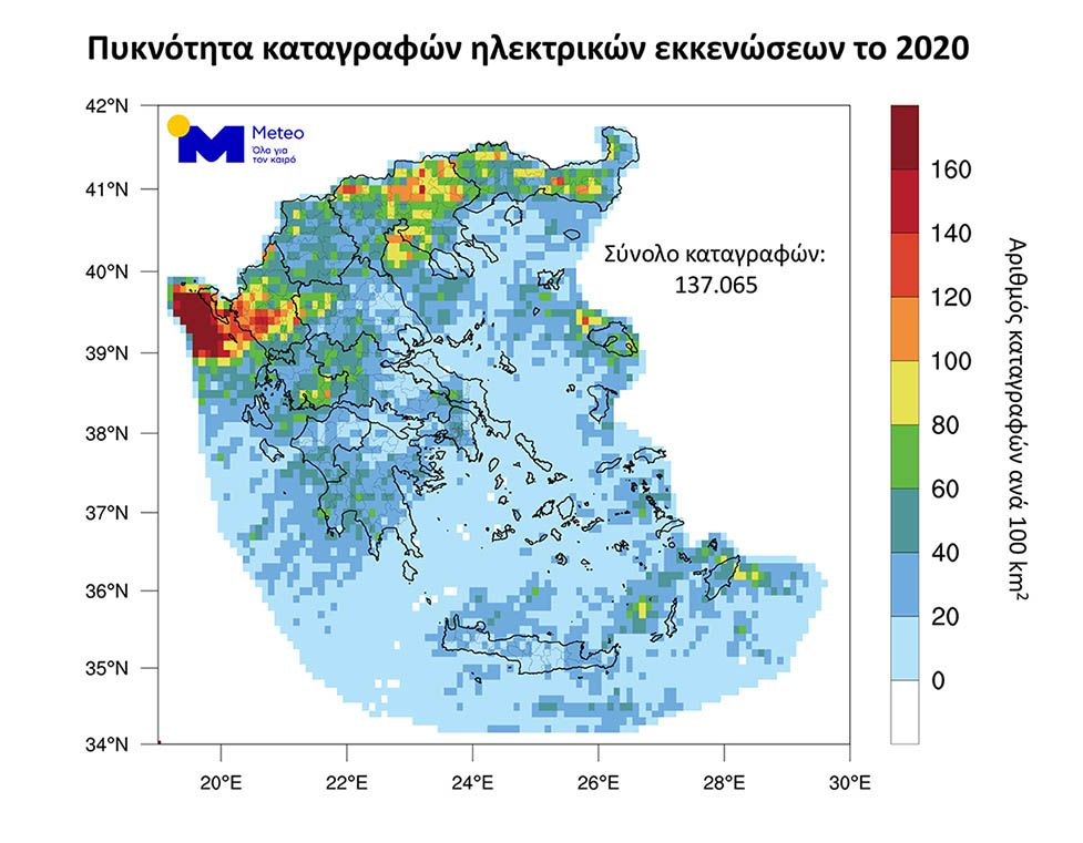 Με βάση τα στοιχεία για την πυκνότητα των συνολικά 137.065 ηλεκτρικών εκκενώσεων που κατέγραψε το σύστημα ανίχνευσης του Εθνικού Αστεροσκοπείου Αθηνών/meteo.gr «ZEUS»το 2020 (η πλειοψηφία των οποίων αφορά κεραυνούς και ένα μικρό ποσοστό αστραπών), η μέγιστη ημερήσια κεραυνική δραστηριότητα καταγράφηκε στο Βόρειο Ιόνιο στις 5 Αυγούστου 2020 κατά την κακοκαιρία «Θάλεια», όταν εντοπίστηκαν περίπου 10.000 κεραυνοί σε ένα 24ωρο.