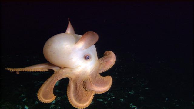 Τα χταπόδια του γένους Grimpoteuthis είναι γνωστά και ως χταπόδια Dumbo, λόγω των μεγάλων πτερυγίων, που προβάλλουν από την κορυφή του σώματός τους, τα οποία μοιάζουν με τα αυτιά του ιπτάμενου ελέφαντα Dumbo, του διάσημου καρτούν του Walt Disney. Αυτά τα όντα ζουν σε εξαιρετικά μεγάλα βάθη, που κυμαίνονται από 3.000 έως 4.000 μέτρα, ενώ κάποια από αυτά απαντώνται μέχρι και στα 7.000 μέτρα κάτω από την επιφάνεια της θάλασσας. Τρέφονται με μαλακόστρακα και έχουν κύριο χαρακτηριστικό τον παράξενο τρόπο που καταναλώνουν την τροφή τους, καθώς καταπίνουν ολόκληρα τα θηράματά τους.Το μεγαλύτερο χταπόδι Dumbo που καταγράφηκε ποτέ, είχε μήκος 1,8 μέτρα και βάρος 5,9 κιλά, αλλά το κανονικό μέγεθος των διαφόρων ειδών αυτού του γένους είναι γενικά μικρότερο.
