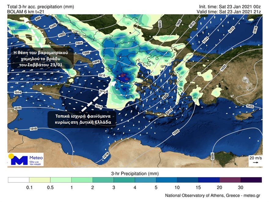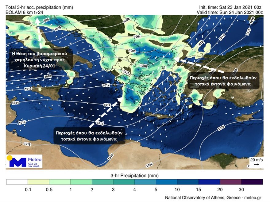 Στους προγνωστικούς χάρτες που ακολουθούν παρουσιάζονται η κατανομή των φαινομένων και οι άνεμοι που θα πνέουν, αργά το βράδυ του Σαββάτου 23/01 και τις πρώτες μεταμεσονύκτιες ώρες προς Κυριακή.
