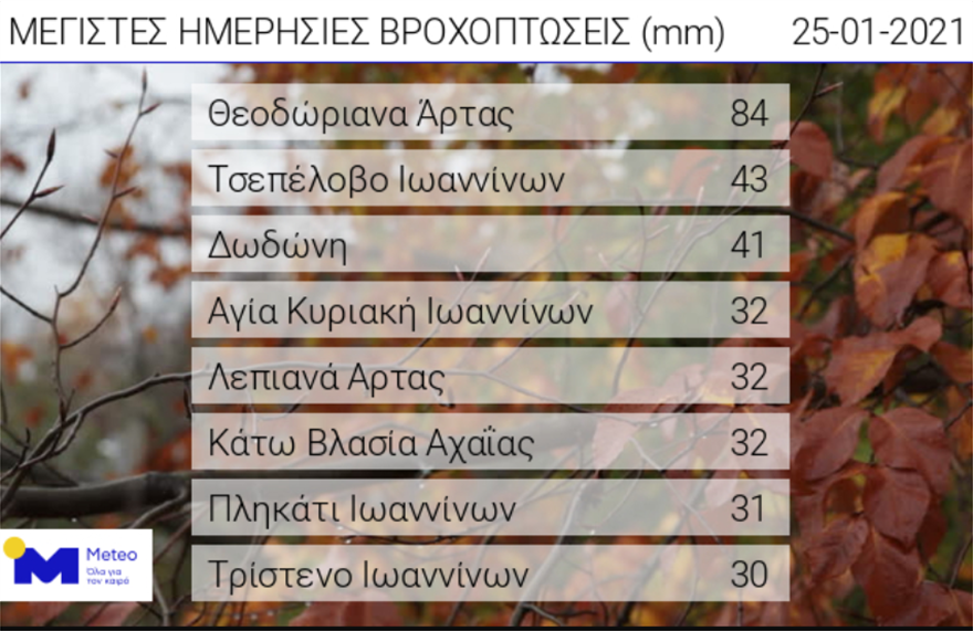 ​Όπως προκύπτει από αυτόν, το μεγαλύτερο ύψος βροχής κατεγράφη στα Θεοδώριανα Άρτας και ήταν ίσο με 84 χιλιοστά.
