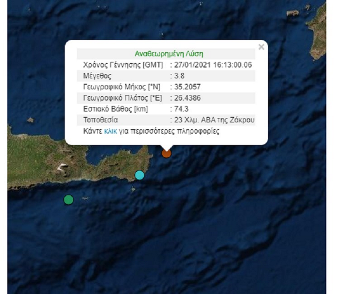 Σεισμική δόνηση μεγέθους 3,8 Ρίχτερ σημειώθηκε στη θαλάσσια περιοχή της Σητείας λίγο μετά τις 6 το απόγευμα της Τετάρτης, σύμφωνα με Γεωδυναμικό Ινστιτούτο.