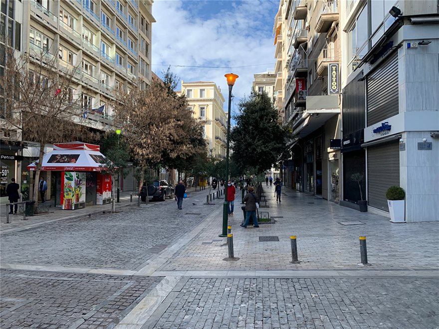 Η οδός Ερμού, ο κεντρικότερος δρόμος της Αθήνας, που τις τελευταίες εβδομάδες ήταν γεμάτος με κόσμο, σήμερα ήταν άδειος και έτσι θα συνεχίσει να είναι για τις επόμενες ώρες, ίσως και ημέρες.