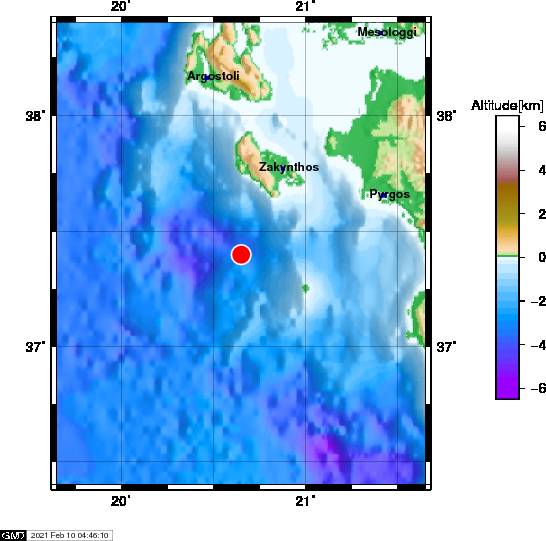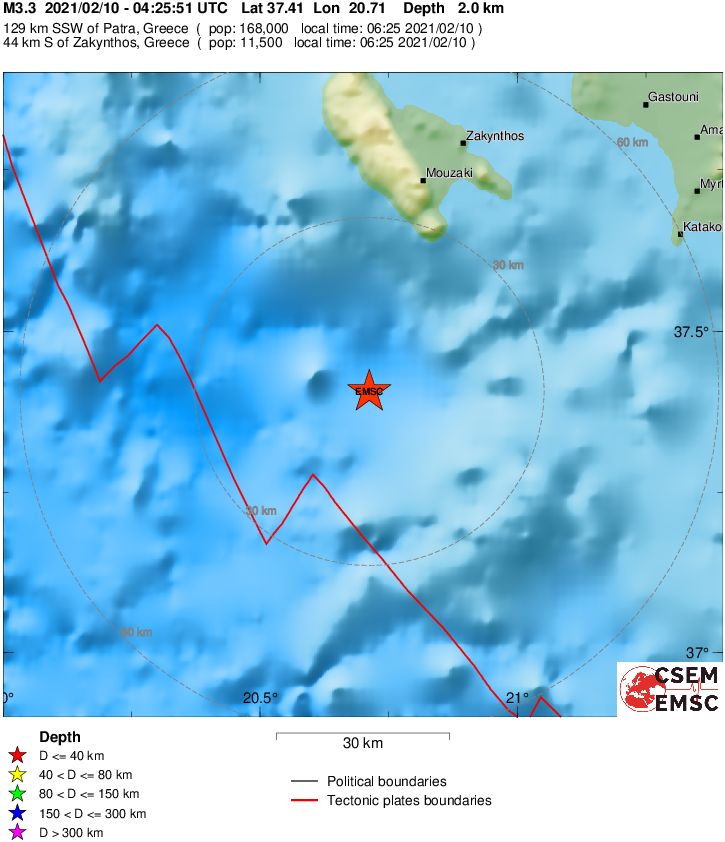 Το ακριβές επίκεντρο της δόνησης εντοπίζεται στα 44 χλμ. νότια από την πόλη της Ζακύνθου σύμφωνα με το EMSC.
