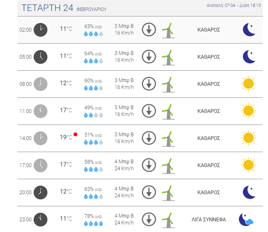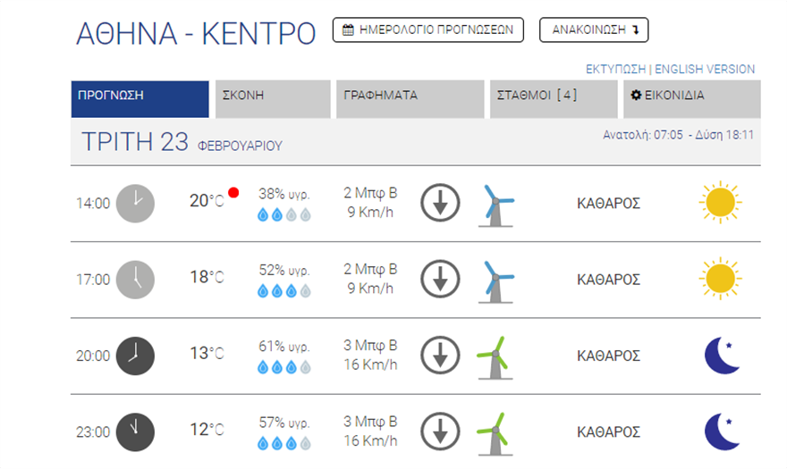 Σύμφωνα με την πρόγνωση της Εθνικής Μετεωρολογικής Υπηρεσίας, στην Αθήνα προβλέπονται άνεμοι βόρειες διευθύνσεις 3 με 4 και στα ανατολικά έως 5 μποφόρ.
