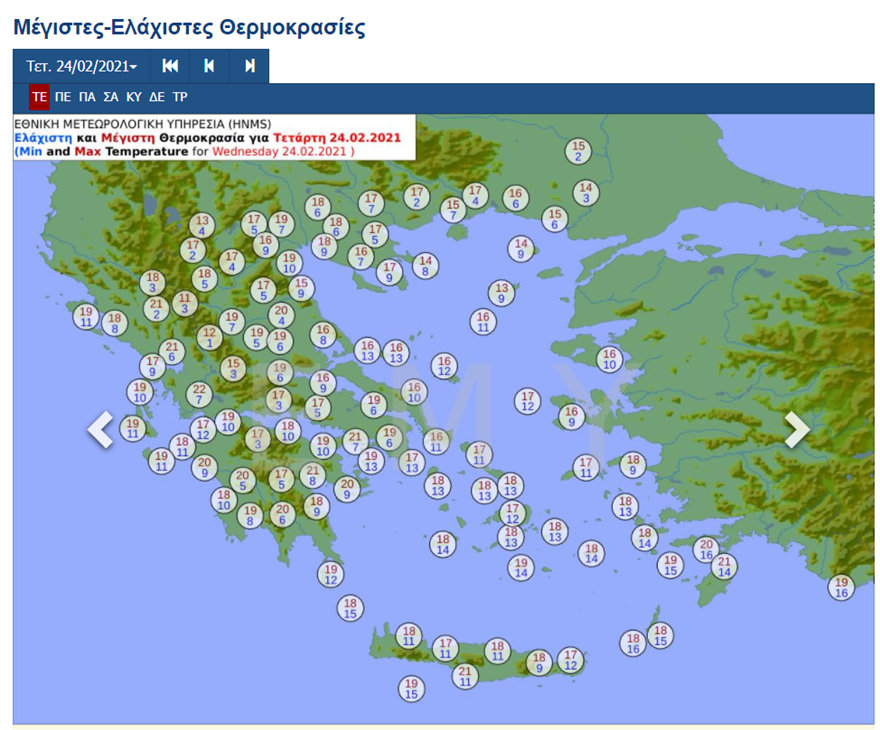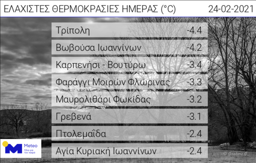 Αξίζει να σημειωθεί ότι σύμφωνα με το δίκτυο αυτόματων μετεωρολογικών σταθμών του Εθνικού Αστεροσκοπείου Αθηνών / meteo.gr, παγετός εκδηλώθηκε κατά τόπους στα ηπειρωτικά το πρωί της Τετάρτης 24/02, με τη χαμηλότερη θερμοκρασία να καταγράφεται στην Τρίπολη με -4,4 βαθμούς Κελσίου.
