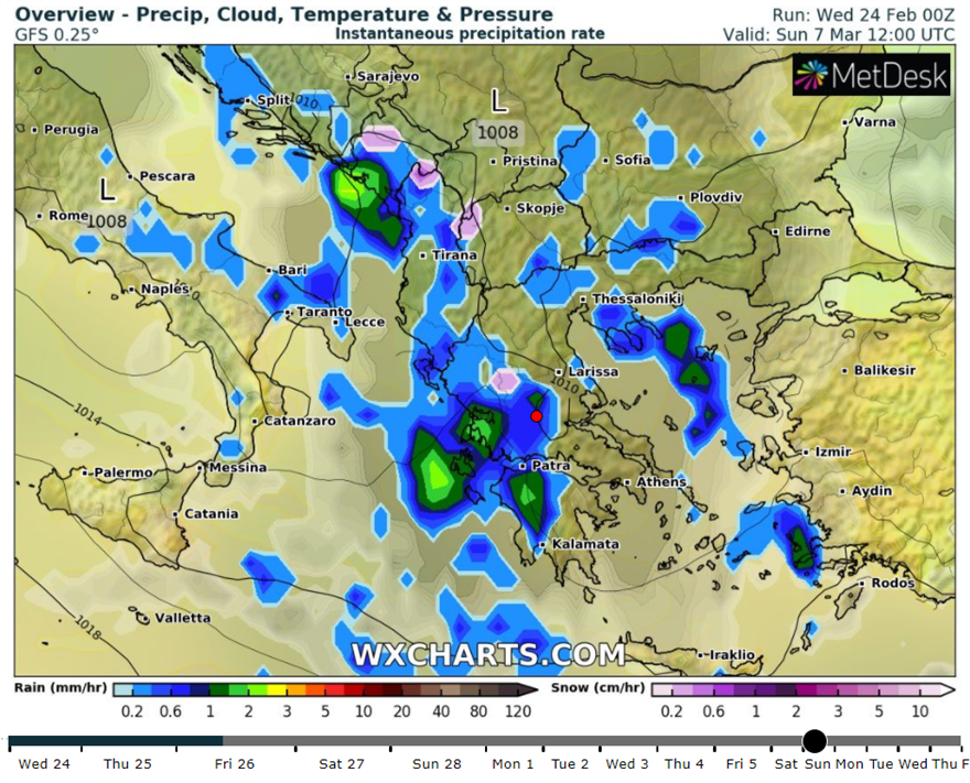 Στον χάρτη που ακολουθεί καταγράφεται το έντονο «κύμα» κακοκαιρίας που θα επηρεάσει τη χώρα στις 6 Μαρτίου