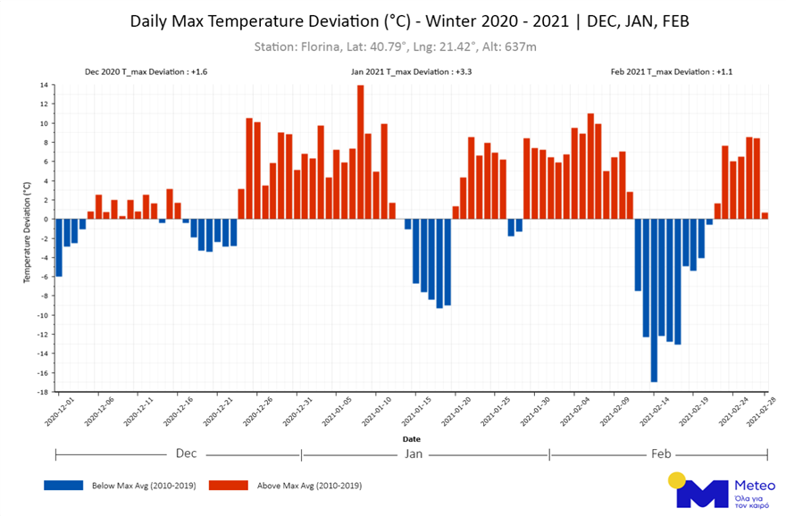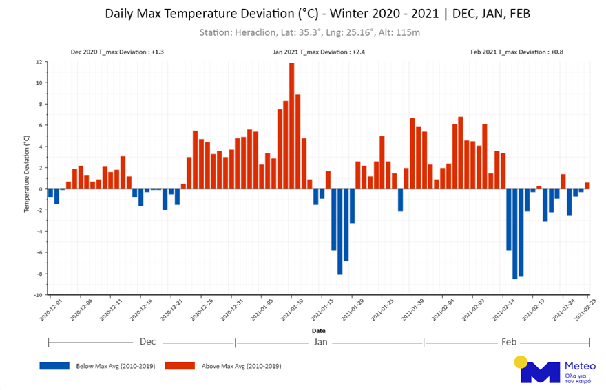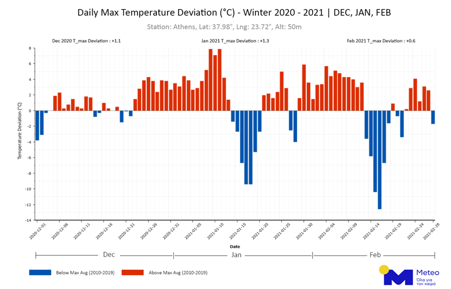 Σύμφωνα με τα όσα προέκυψαν από την ανάλυση της μέγιστης θερμοκρασίας ανά ημέρα και την απόκλισή της από τη μέση τιμή της τελευταίας δεκαετίας (2010-2019) για τέσσερις πόλεις της Ελλάδας όπου λειτουργούν εδώ και πολλά χρόνια σταθμοί του Εθνικού Αστεροσκοπείου Αθηνών/meteo.gr, ο φετινός χειμώνας, χαρακτηρίζεται ως ζεστός με εξαίρεση τις περιόδους δύο συγκεκριμένων κακοκαιριών.