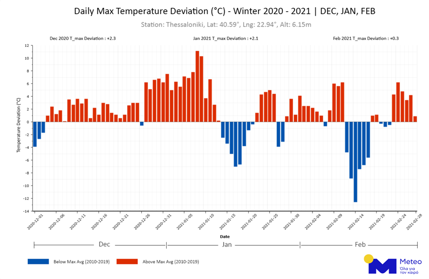 Όπως μπορούμε να δούμε, το μεγαλύτερο διάστημα των τριών μηνών Δεκεμβρίου, Ιανουαρίου και Φεβρουαρίου (90 ημέρες συνολικά) η θερμοκρασία ήταν υψηλότερη από τις κανονικές τιμές για μεγάλο αριθμό ημερών (πχ. για τις 66 από τις 90 ημέρες του χειμώνα στην Θεσσαλονίκη).