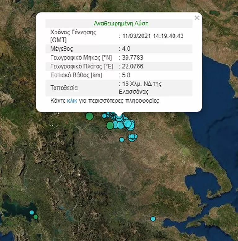 Σύμφωνα με την αναθεωρημένη λύση του Γεωδυναμικού Ινστιτούτου του Εθνικού Αστεροσκοπείου Αθηνών, σεισμική δόνηση μεγέθους 4 βαθμών της κλίμακας Ρίχτερ, σημειώθηκε στις 16:19 κοντά στη Λάρισα.