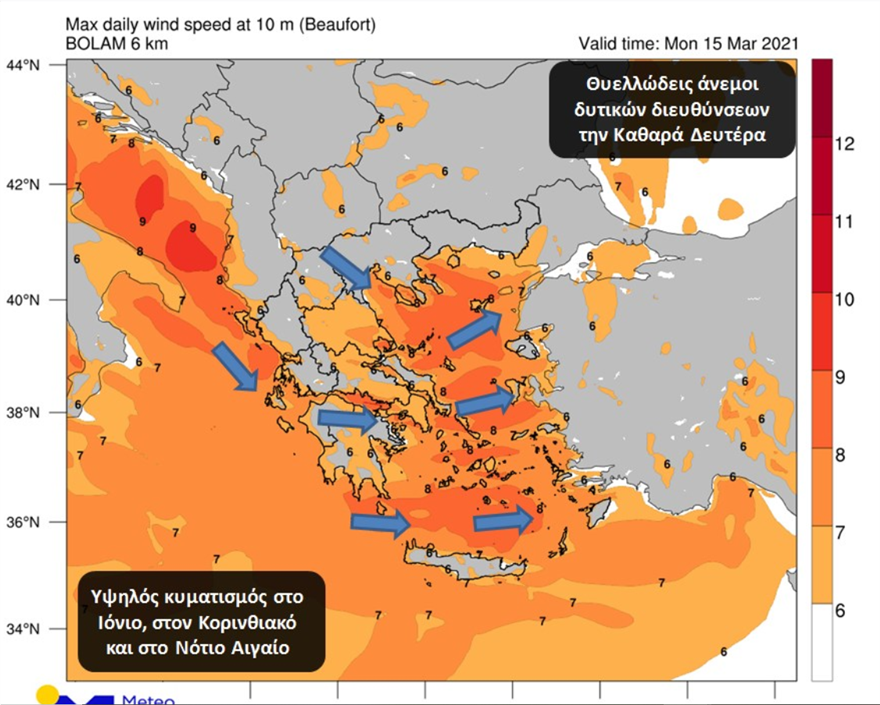 Παράλληλα, θυελλώδεις άνεμοι δυτικών διευθύνσεων θα πνέουν κυρίως στις θάλασσες, αλλά και κατά τόπους σε ηπειρωτικά τμήματα. Υψηλός θα είναι επίσης ο κυματισμός που στο Ιόνιο, στο Αιγαίο και στον Κορινθιακό Κόλπο όπου θα εκδηλωθεί έντονος καναλισμός των ανέμων.