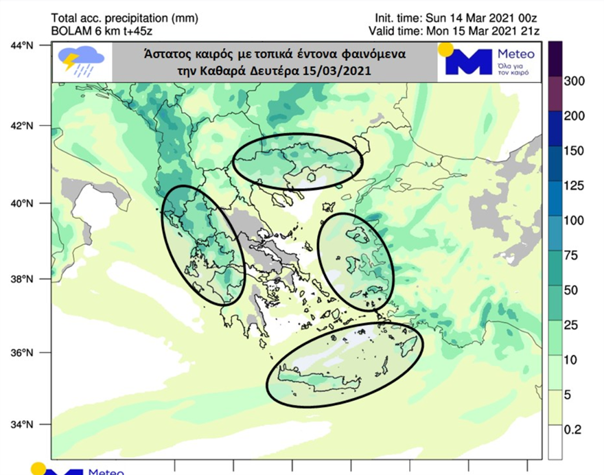 Στον προγνωστικό χάρτη που ακολουθεί παρουσιάζεται η γεωγραφική κατανομή των φαινομένων που θα εκδηλωθούν.