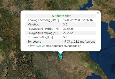 Σύμφωνα με την αυτόματη λύση που ανακοινώθηκε, ο σεισμός είχε επίκεντρο 17χλμ. βορειοδυτικά της Λάρισας.