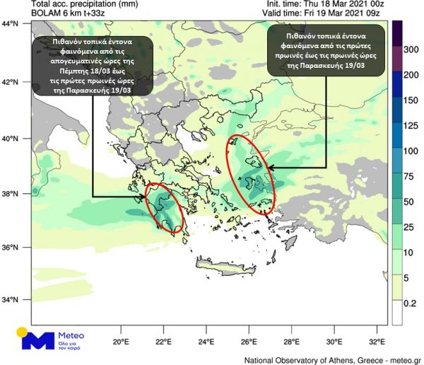 Βαθμιαία τα φαινόμενα θα επεκταθούν ανατολικά και θα επηρεάσουν τα κεντρικά τμήματα, ενώ από τις βραδινές ώρες της Πέμπτης 18/03 έως τις πρωινές ώρες της Παρασκευής 19/03 βροχές και τοπικές καταιγίδες θα εκδηλωθούν στα νησιά του Ανατολικού και Βορείου Αιγαίου, στις Κυκλάδες, στην Ανατολική Μακεδονία και στη Θράκη, ενώ στις υπόλοιπες περιοχές θα εξασθενήσουν.