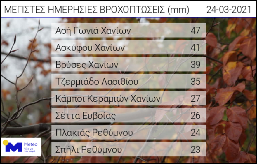 Σημαντικές βροχές σημειώθηκαν κατά κύριο λόγο σε Εύβοια και Κρήτη έως το πρωί της Τετάρτης 24/03. Όπως προκύπτει από τον σχετικό πίνακα που παρουσιάζει τους 8 σταθμούς που κατέγραψαν τα μεγαλύτερα ύψη βροχής, στην Ασή Γωνιά Χανίων το ολικό ύψος έφτασε τα 47 χιλιοστά.
