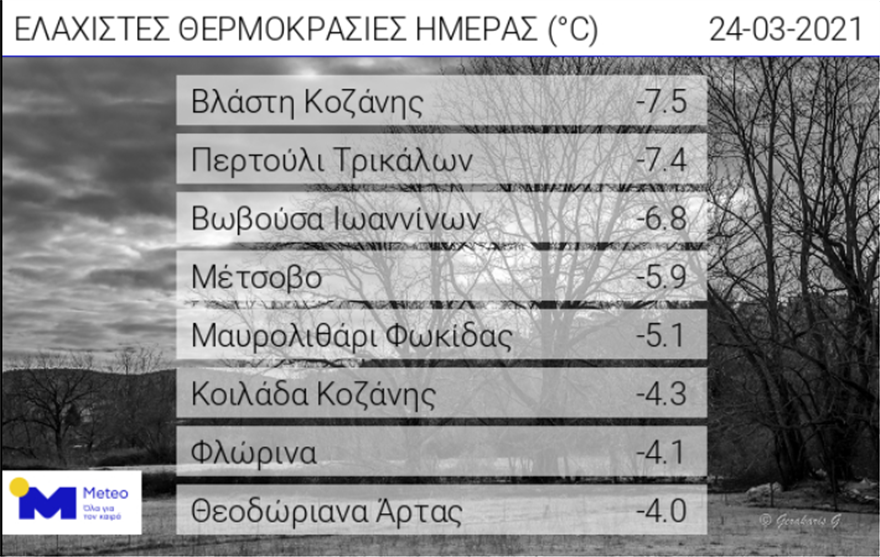 Στον σχετικό πίνακα παρουσιάζονται οι 8 σταθμοί του δικτύου αυτόματων μετεωρολογικών σταθμών του Εθνικού Αστεροσκοπείου Αθηνών / meteo.gr που κατέγραψαν τις χαμηλότερες θερμοκρασίες. Όπως φαίνεται σε αυτόν, η απολύτως χαμηλότερη καταγράφηκε στη Βλάστη Κοζάνης και ήταν ίση με -7.5 βαθμούς Κελσίου.