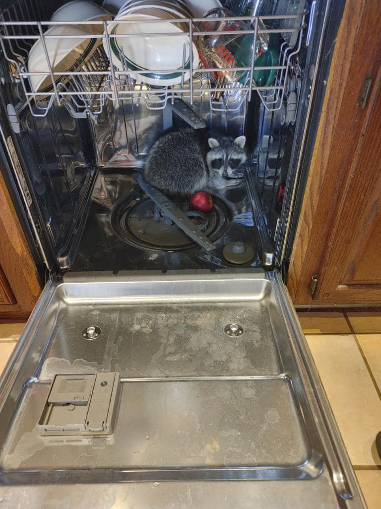 Το ρακούν, αφού μπήκε στο σπίτι από το μπάνιο και έφαγε ό,τι βρήκε στην κουζίνα, αποφάσισε να πάρει έναν υπνάκο στο πλυντήριο πιάτων, για να χωνέψει.