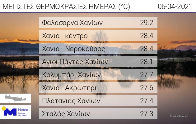 Η υψηλότερη θερμοκρασία σημειώθηκε το πρωί στα Φαλάσαρνα Χανίων, όπου έφθασε τους 29,2 βαθμούς Κελσίου. Ακολούθησαν το κέντρο της πόλης και ο Νεροκούρος Χανίων(από 28,4), οι Άγιοι Πάντες Χανίων (28,1), το Κολυμπάρι (27,6) και το Ακρωτήρι Χανίων (27,6).