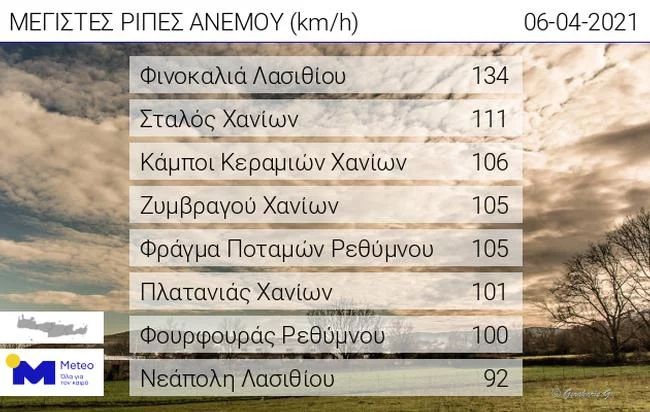 Το δίκτυο των αυτόματων μετεωρολογικών σταθμών του Εθνικού Αστεροσκοπείου Αθηνών / meteo.gr στην Κρήτη κατέγραψε τις ισχυρότερες ριπές ανέμου έως το πρωί σήμερα στη Φινοκαλιά Λασιθίου (134 χλμ/ώρα) και στο Σταλό Χανίων (111 χλμ/ώρα).