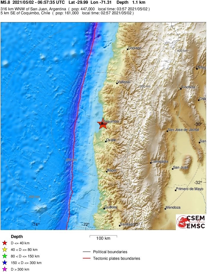 Ισχυρή σεισμική δόνηση 6 βαθμών της κλίμακας Ρίχτερ σημειώθηκε ανοιχτά του Κοκίμπο, στην Χιλή, ανακοίνωσε σήμερα το Ευρωμεσογειακό Σεισμολογικό Κέντρο (EMSC).