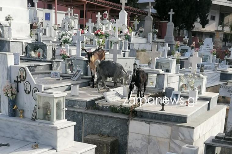 Τρία κατσίκια «έκοβαν βόλτες» το απόγευμα της Τετάρτης, καταμεσής στο κοιμητήριο Αγίας Φωτεινής, στη Χαλέπα Χανίων.