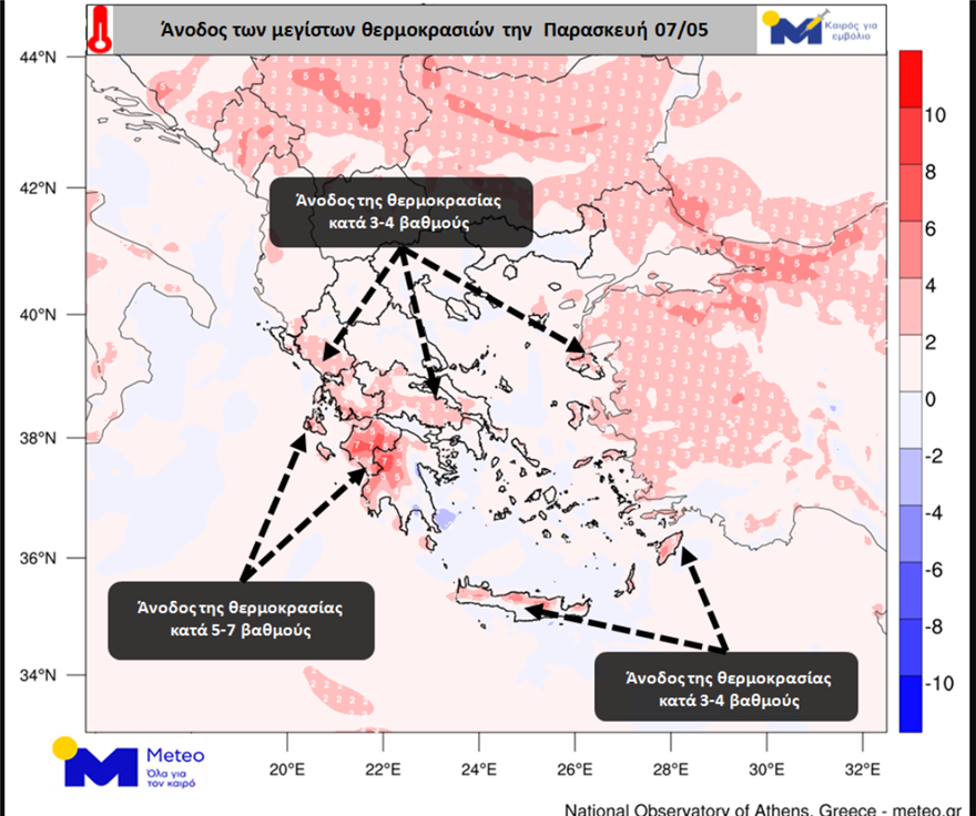 Σύμφωνα με τα προγνωστικά στοιχεία του Εθνικού Αστεροσκοπείου Αθηνών / Meteo.gr, την ερχόμενη Παρασκευή 8 Μαΐου, η θερμοκρασία αναμένεται να παρουσιάσει περαιτέρω άνοδο η οποία θα είναι γενικά της τάξης των 3-4 βαθμών Κελσίου.