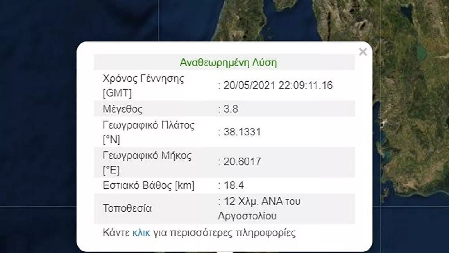 Σεισμός μεγέθους 3,8 βαθμών της κλίμακας Ρίχτερ σημειώθηκε, κατά τις πρώτες πρωινές ώρες της Παρασκευής (21/05), στην Κεφαλονιά.