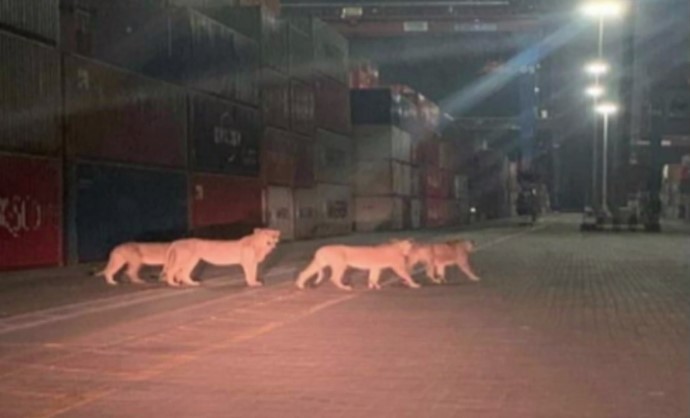 H φωτογραφία με τα 4 λιοντάρια να βολτάρουν έξω από χώρο με κοντέινερ που υποτίθεται οτι ήταν στον Πειραιά, αποδείχθηκε fake news.