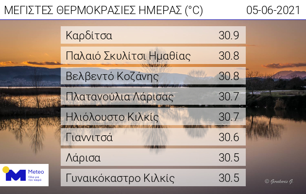 Όπως προκύπτει από αυτόν, η απολύτως υψηλότερη σημειώθηκε στην Καρδίτσα (30.9°C) και ακολούθησαν το Παλαιό Σκυλίτσι Ημαθίας και το Βελβεντό Κοζάνης (30.8°C).