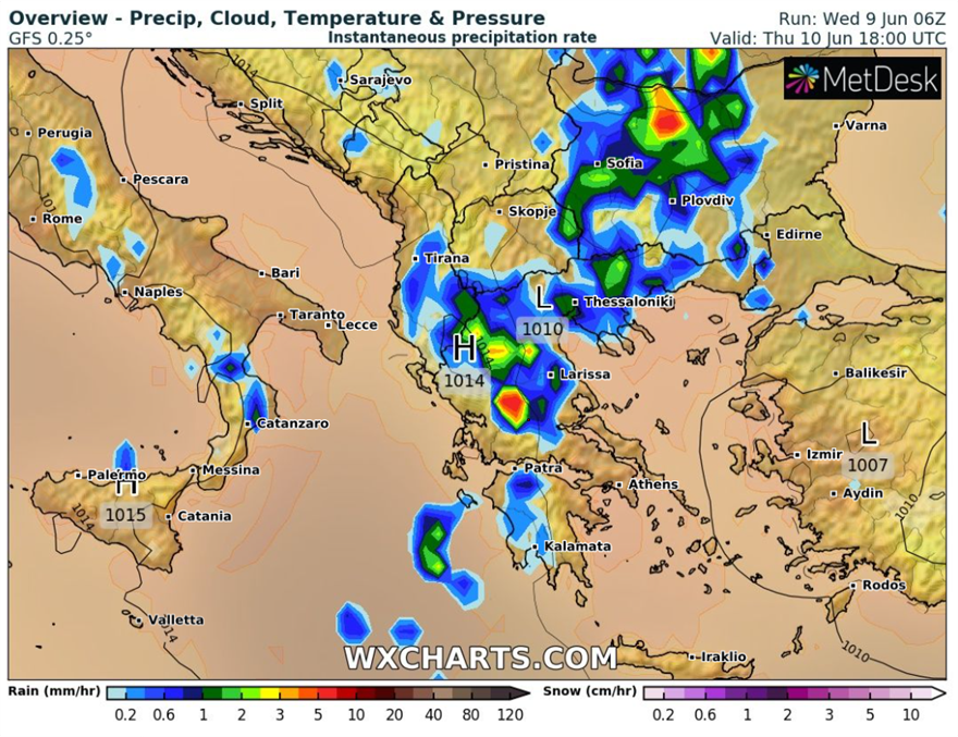 Σε εξέλιξη βρίσκεται η κακοκαιρία και σήμερα Πέμπτη 10 Ιουνίου, με εντονότερα φαινόμενα στην Πελοπόννησο, στη Δυτική Στερεά, στην Ήπειρο και στη Μακεδονία.