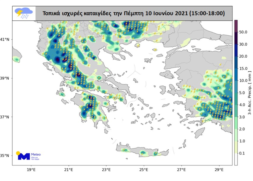 Οι καταιγίδες θα συνοδεύονται κατά τόπους από αυξημένη ηλεκτρική δραστηριότητα, ενισχυμένους ριπαίους ανέμους και σε ορισμένες περιπτώσεις χαλαζοπτώσεις.
