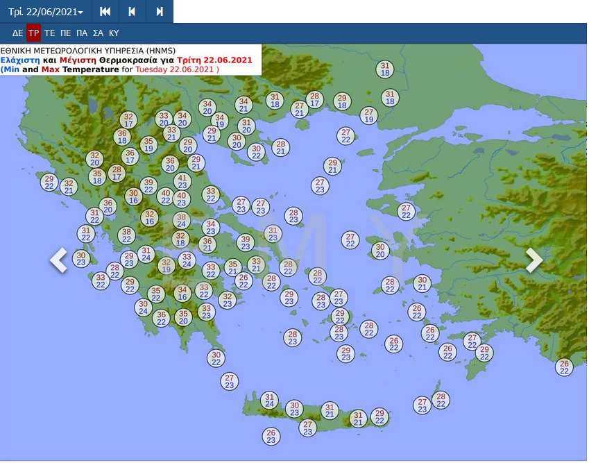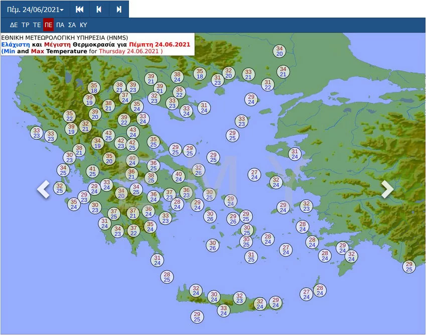 Η κορύφωση του κύματος ζέστης εκτιμάται το τριήμερο Πέμπτη 24/06 – Σάββατο 26/06, οπότε σε αρκετές περιοχές της χώρας θα επικρατήσουν συνθήκες καύσωνα, με τις μέγιστες θερμοκρασίες να φτάνουν κατά τόπους τους 41-43 βαθμούς Κελσίου.