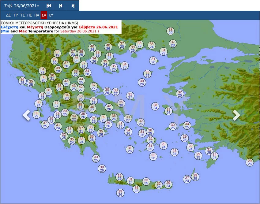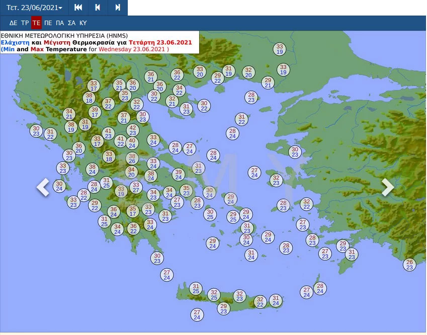 Τις επόμενες ημέρες, όπως προκύπτει από την πρόγνωση της ΕΜΥ, η θερμοκρασία θα συνεχίσει να κινείται σε υψηλά επίπεδα. Την Τετάρτη θα φτάσει κατά τόπους τους 41 βαθμούς, ενώ το Σάββατο και την Κυριακή αναμένεται να αγγίξει τους 44 και 45 στα κεντρικά ηπειρωτικά.