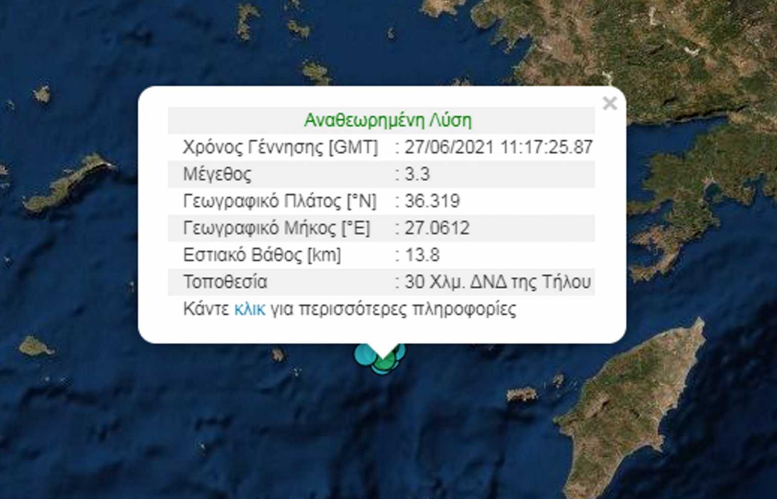 Το ακριβές επίκεντρο βρίσκεται στα 30 χιλιόμετρα δυτικά – νοτιοδυτικά της Τήλου στον ίδιο θαλάσσιο χώρο όπου τα τελευταία 24ωρα καταγράφεται έντονη σεισμική δραστηριότητα.