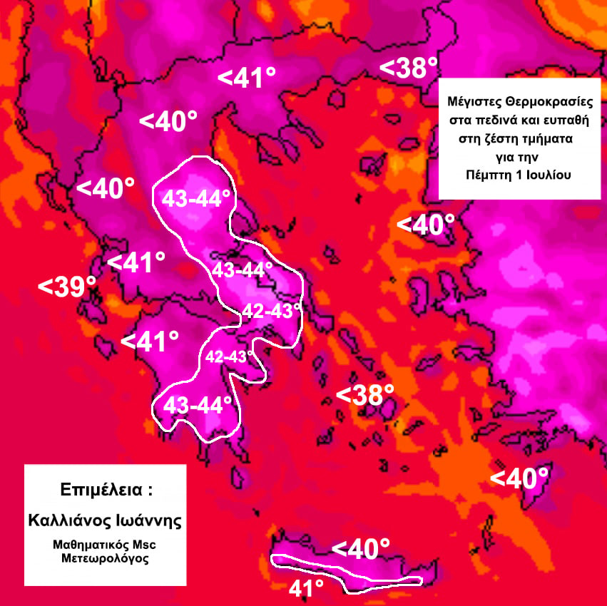 «Όμως θα επιμείνω για κάποια συγκεκριμένα τμήματα της επικράτειας όπου εκεί ο υδράργυρος θα ξεπεράσει και τους 42°C και πιθανότατα να φτάσει τους 43°C και ίσως πολύ τοπικά και τους 44°C. Άρα την Πέμπτη θα τη θυμόμαστε για καιρό λόγω και της αυξημένης δυσφορίας και τις βραδινές ώρες ειδικά στις μεγαλουπόλεις».