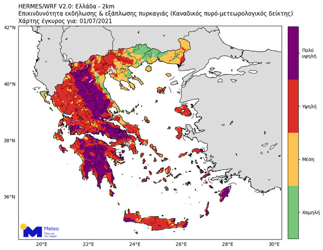 Με βάση τον καναδικό πυρομετεωρολογικό δείκτη, ο οποίος υπολογίζεται meteo.gr, για σήμερα Τετάρτη 30 Ιουνίου αναμένεται πολύ υψηλή επικινδυνότητα για εκδήλωση και εξάπλωση δασικών πυρκαγιών στις Κυκλάδες, την Κρήτη και το Αν. Αιγαίο και κατά τόπους στην Πελοπόννησο.